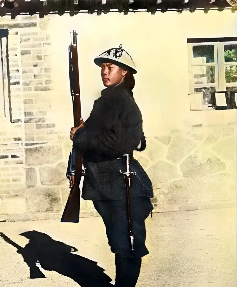 图中这位清末新军士兵,头上这顶白色凉帽边缘有金属压条,脑后拖着发辫,身上黑呢军装腰间一柄长刺刀晃着冷光,手里抱的是五连发的“曼利夏”后装步枪,木质枪托包浆发亮,枪机那块金属边缘已经被磨得圆顺了。