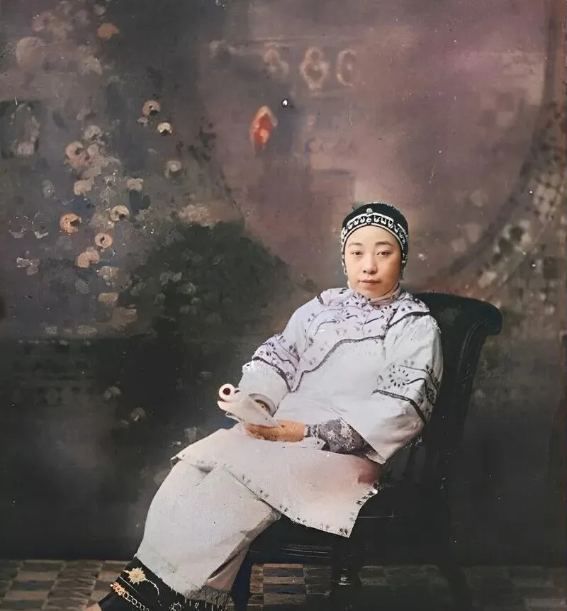 这位坐在椅子上的女子,馆里常说的“影楼照”,背后是一整幅油画幕布,牡丹暗红,团纹隐隐,她身上一水浅紫滚边的长衫,袖口绣密针细线,脚上小巧的弓鞋,鞋尖儿捏着花样,手里随意握一卷纸书,笑不露齿,眼神稳当。