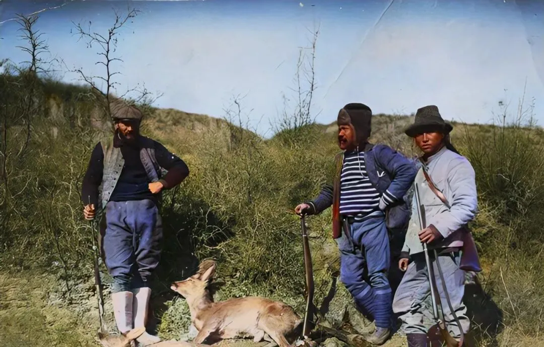 这张是在西北的山沟里,两个外国人一中国猎人,三个人三杆枪,枪长不一,木托都厚,地上躺着一头小狍子,草茎绕着蹄,旁边还有只野兔的影子模糊着,衣服看得出路途远,脚上绑腿勒得紧,帽檐压得低。