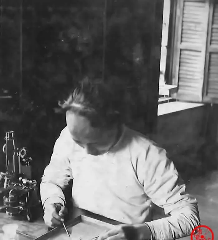 图中这排器材叫显微镜和切片盒,黑漆底座配黄铜镜筒,粗调细调在指尖一拧一松,眼睛凑上去,世界立刻变小又变大,后头站着的外籍教师正俯身看学生操作,桌上有小酒精灯和滴瓶,滋啦一声点火,很快冒出一缕蓝焰,那时候看细菌看花粉算前沿,现在手机镜头都能微距拍,但那种第一次把“看不见”变成“看得见”的惊讶,真是忘不掉。