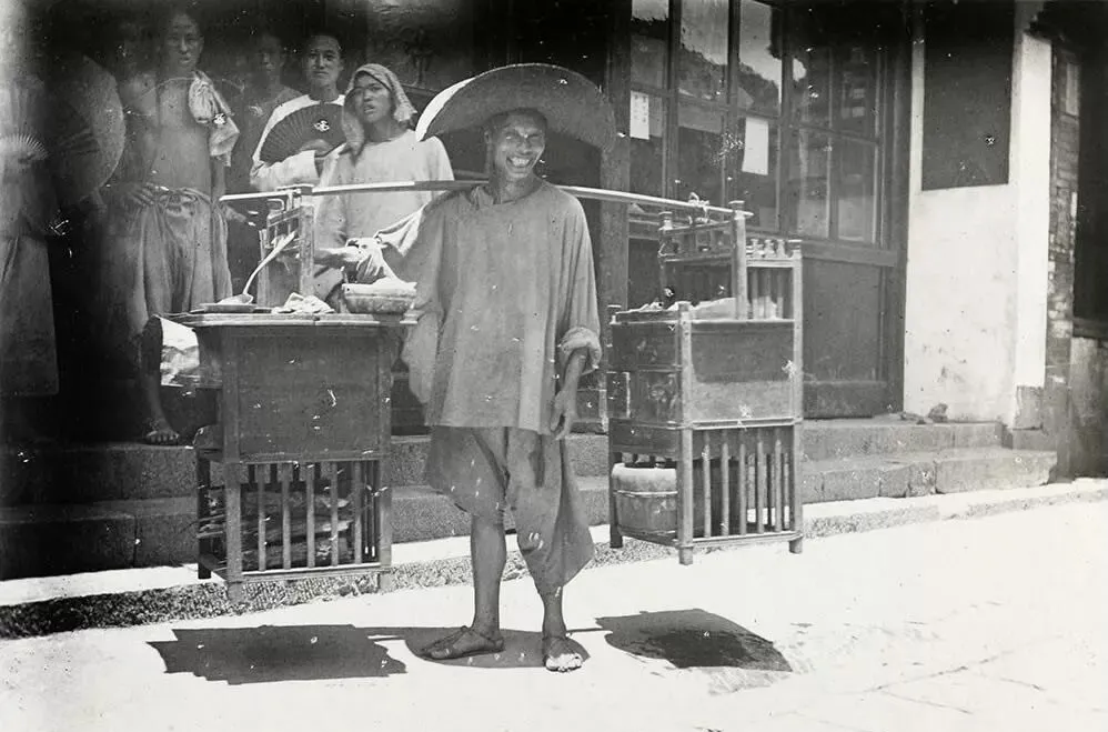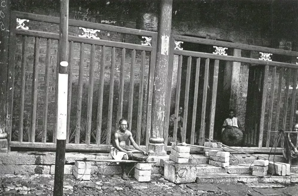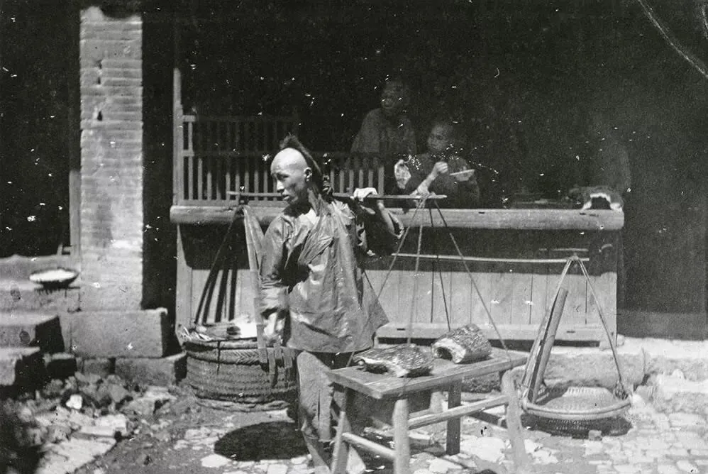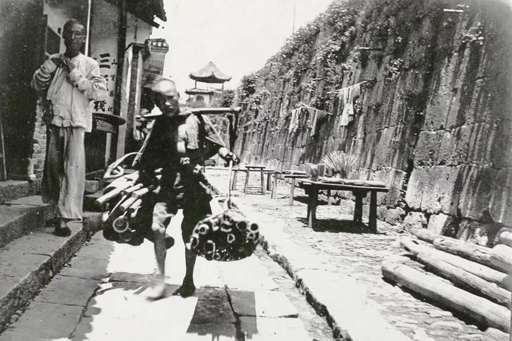 这位扎着发辫的叫挑夫,肩上两捆铁器叮当作响,脚丫子打在青石板上啪啪的脆,身前身后全是窄巷拐弯,他得把步子踩得稳,不然扁担一甩整个人就横着撞墙,外公说雇一天人钱不多,重货却一点不轻,天黑也走,走急了,只听得一串硬碰硬的金属声在巷子里回荡。