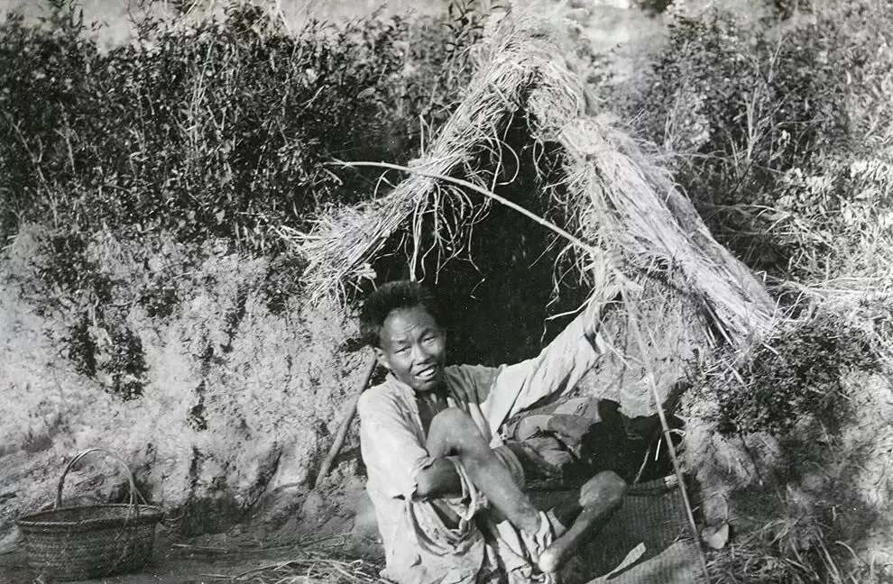 这个四面透风的草棚就是“窝棚”,稻草扎成三角顶,门口斜插两根木杖,里面一张破席就当床,照片里的人缩着腿靠住门柱,旁边空篓子还没打到米,奶奶说那年月救济也有,可轮不到边上的人,天一刮起风,草叶子呼啦啦地响,晚上更冷,能挡雨就谢天谢地了。