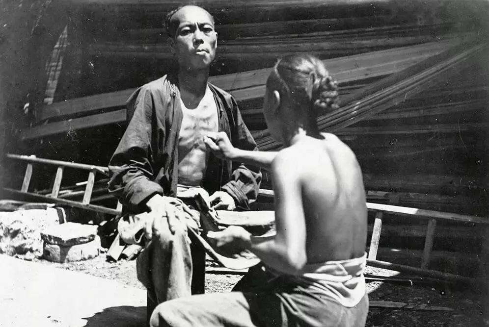 这个场景叫推拿拔罐的土法缓痛,前面那人赤着背,后面的人手里抓着一团草药灰,指节在肋间一寸寸按,旁边搁着瓷碗和火折子,汗顺着脊梁往下流,别说讲究不讲究,疼得受不了就这样顶着,爷爷说请郎中要钱,土法不一定灵,图个心安也好。