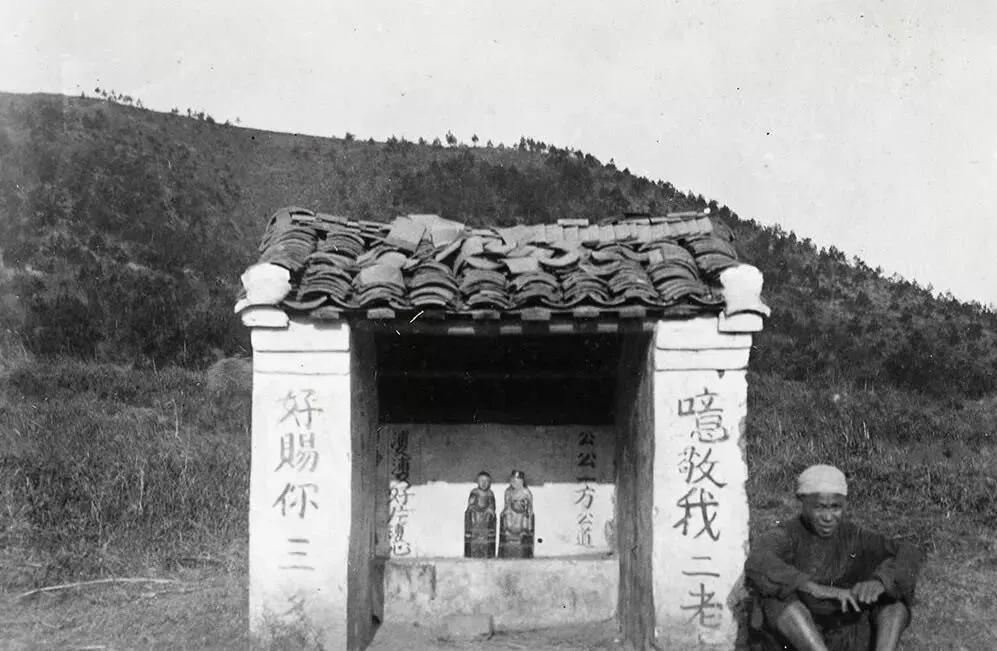 这个小砖屋就是土地庙,瓦片压得乱七八糟,门柱上写着“噫敬我二老,好赐你三多”,里头泥塑一公一婆,案上插着香灰筒,边上老汉抱膝坐着喘匀,娘说赶集回来顺道磕个头,求个路平安,那时走几十里山道,全靠心里这点底气。