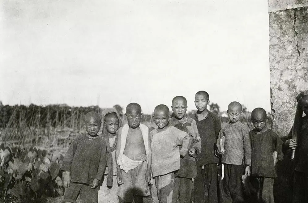 图中这些剃着圆头的孩子就是村里学徒和放牛娃,衣裳洗得发白,袖口全是补丁,有个抱着书板的站最右,笑得露出豁牙,我小时候听外公说,念书得走很远,遇上阴天下雨怕把课本打湿,拿玉米叶裹一层,再用草绳绑住,书不多,劲头倒真。