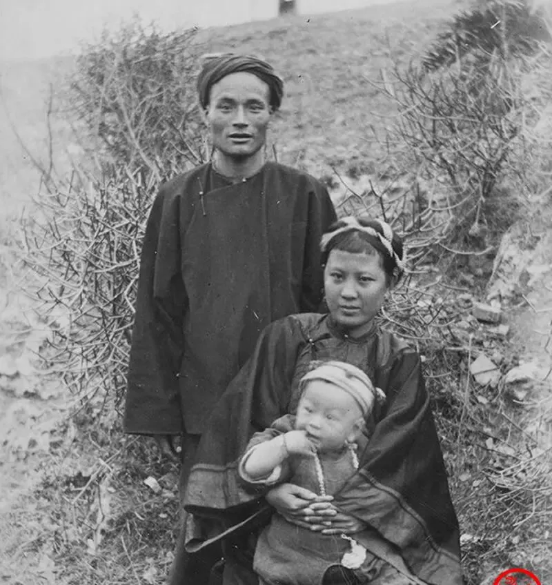 图中这一家叫合影老照片,男人站着,女人抱着孩子坐着,男主人衣襟宽大靠一条腰带就拢住了,头上缠着布巾,女主人发髻上插着细簪,怀里娃的手里还攥着一串珠串,像是怕他乱动才给的玩意儿,我外婆总说那时候照相少,娃一哭就糟糕,所以先把嘴给他塞点东西安静会儿,这一家站位有点意思,男的站女的坐,气口倒是平和,像是刚干完活喘匀了才让洋相馆的先生按下快门。