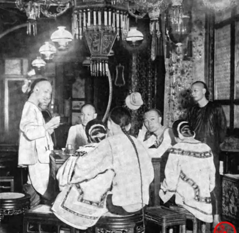 这艘在水上的屋子叫花船,屋里挂着雕花灯,桌上茶盏细瓷,角落里摆着屏风,男人们或坐或站,背影里两位年轻女子衣领滚着细边,发髻压得服帖,掌柜模样的人笑着递盏茶,奶奶说旧社会有钱有闲的人最会找地儿消磨夜色,吃的喝的玩意儿一样不缺,现在人说“社交”,那时叫“做局”,换了词,绕的是同一道弯水。