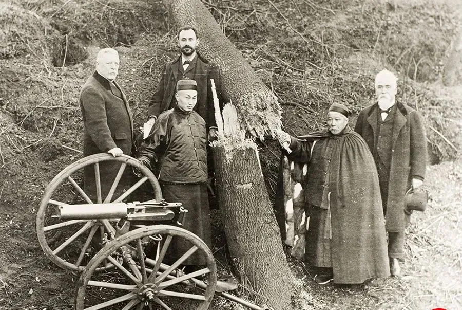 晚清老照片:李鸿章观看马克沁机枪射击,年轻男女“花船”里摆盛宴。