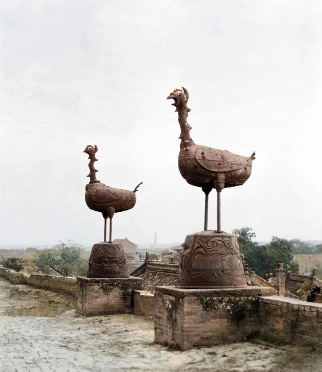 图中这对铁疙瘩叫大铁鸟,生铁浇的身子,圆滚滚的腹腔上刻着云纹和小洞,脖颈分节,最醒目的是脖子上突出的刺,像是把羽翎硬生生立起来了,前面这只张着嘴,喙尖朝天像在长啸,后面那只闭着嘴收着神,站姿却一样倔,双腿是两根直杆插进鼓形底座里,底座也不是光溜溜的,边沿一圈缠着波浪纹和兽面,立在城墙女儿墙上,背后是灰青的城砖和远处的树梢。