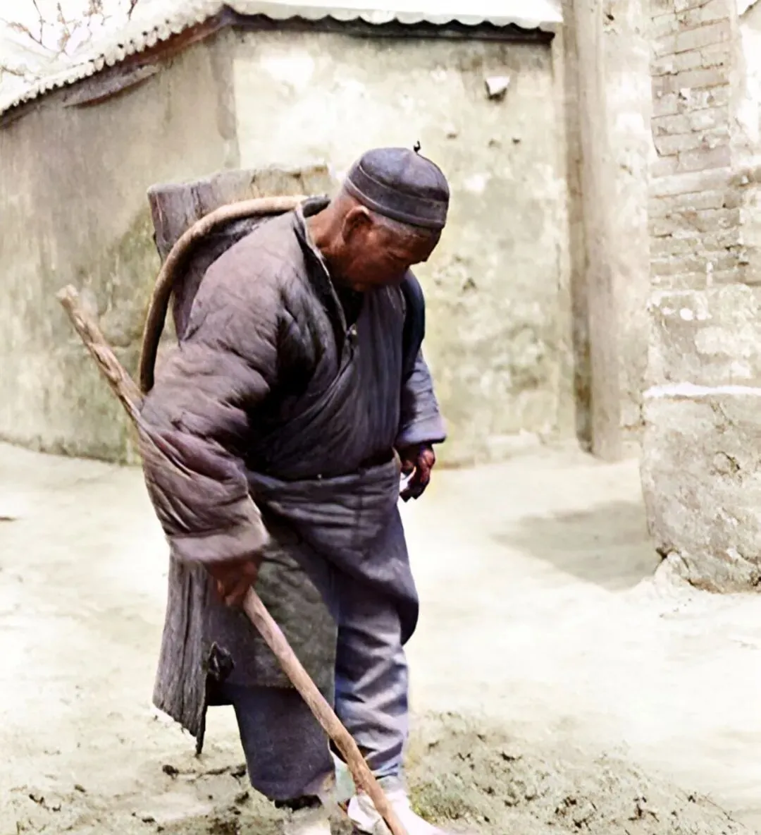 这个背着竹篓弯着腰的叫拾粪的老人,粗布棉袄鼓鼓的,袖口油亮,左手攥着一把小铁铲,铁铲并不起眼,厉害在那一抹角度,微微往前倾,刃口贴地一蹭,泥面和粪一起被抄起一层薄片,胳膊一抖,木把在竹篓沿上一磕,粪坨就稳稳落进篓里,利落得很。