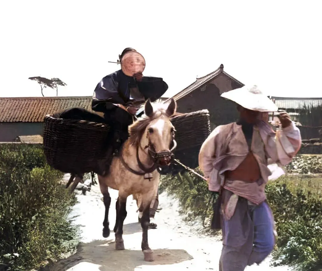 图中这位新媳妇,骑的是骡子不是真马,骡背两侧各挂一只柳条大箩筐,鼓鼓囊囊装着面点布匹和见面礼,缰绳在前头男人手里,草帽压得低低的,正是结婚第三天回门的讲究日子,碰上拿相机的洋人时,小媳妇抬手一把团扇,唰地挡住了脸,动作挺利索的。