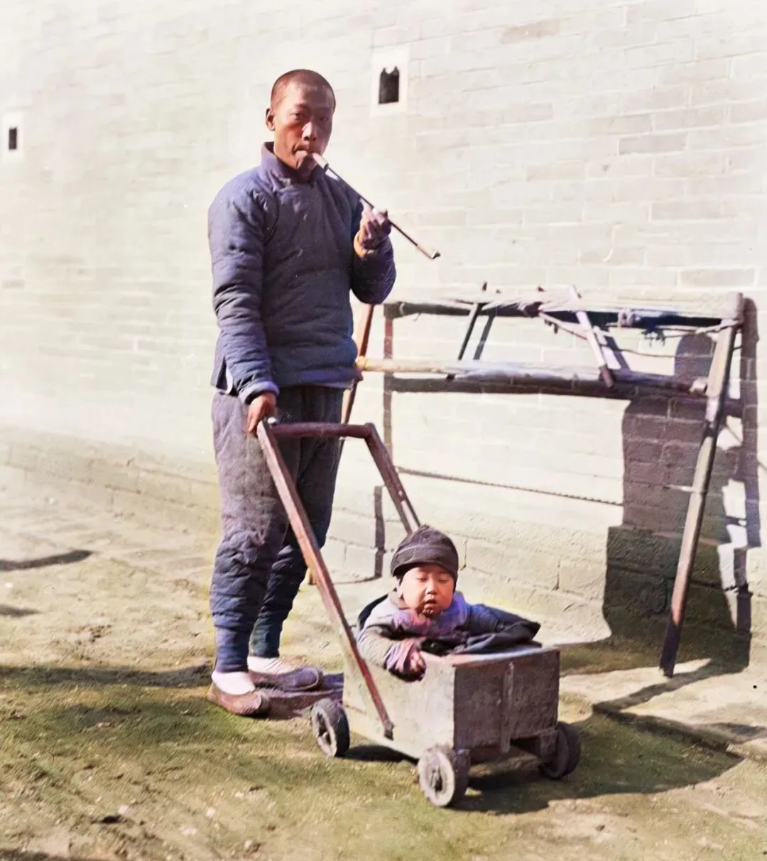 这个木头家伙叫小推车,方方正正一只匣子,四个车轮吱呀转,前面一个带活轴的把手,男人一手扶杆子一手叼着长烟袋,烟锅黑亮,烟袋杆细细长长,孩子窝在木匣里,脑袋一点一点的,眼皮打着架,差不多要睡过去了。