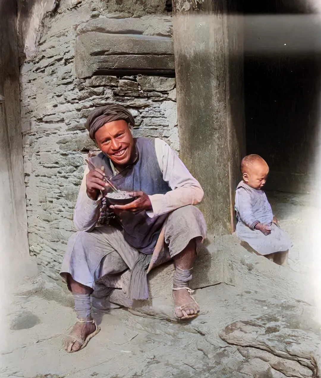 这个笑得合不拢嘴的汉子,端着个黑粗瓷碗,筷子夹的像是窝锅头加野菜,脚上草鞋麻绳缠着脚脖,门槛里头缩着个小娃,眼睛眯成缝,石头墙面被手磨得发亮,阳光从巷口斜斜打进来,尘土细得像面,落在裤腿上都懒得拍。