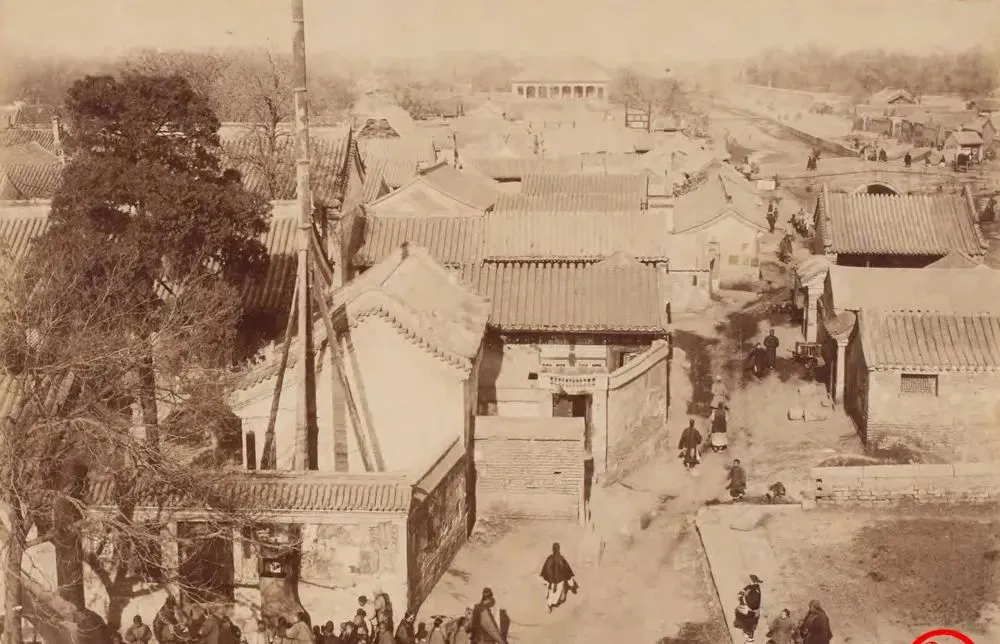 图中这一片低矮的灰瓦房叫四合院,墙是糙砖砌的,门楼上有小挑檐,院墙外的电杆细得像筷子,树杈秃着头,巷口人影密密麻麻,都是赶路的挑担人和买卖人,拐进这类小巷,半截日光就被房檐挡住了,脚底下是土路,风一来,尘土就往裤腿里钻。