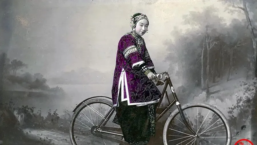 这个上了色的相片里,姑娘穿紫色缎面长袍,领口袖口一圈一圈的绣线亮得很,脚裹得小小的却踩在踏板上,身子微微前倾,像风把她往前托,背景是画景布上的树林和湖水,影楼的老师傅估计让她先学会推,再扶着墙上车,咔嚓一下就定格了,奶奶说那阵子要是女孩子会骑车,回头率高得很,街坊会在巷口窃窃私语,这叫新派,如今地铁里满眼都是运动鞋与折叠车,谁还留意谁骑不骑车呢。