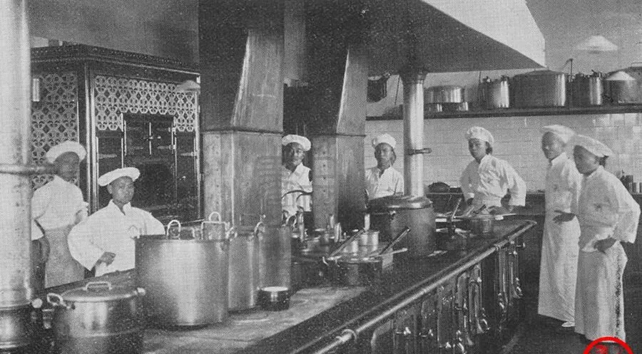 这个宽敞的地方叫汇中饭店厨房,炉台被擦得发黑发亮,前面一溜大汤锅,盖子圆圆的,蒸汽往上冒,后墙挂着铜勺长柄铲,像一排士兵站岗,厨师套着白围裙戴高帽,站姿端正,神情有点紧却带兴奋,估摸着刚学了道新菜,奶油加高汤小火咕嘟,勺背一抹就知道稠不稠,老师傅在旁边只说一句话“火候别猛”,那时候会做西餐的年轻人稀罕得很,出门能顶个名头,现在手机上搜个菜名,教程一大把,可真要做出锅气和层次,还是得在灶前站够时间。