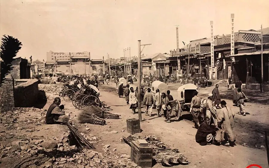 图中这条路叫前门大街,庚子事变后像被火舔过一遍,左侧商铺成了瓦砾堆,箭楼塌了半截,路心却还挤满推车的、抬轿的、挑担的,碎石上摆着扫帚和箩筐,卖家把蒲扫一捆一捆码齐,买家就地砍价,生活这东西吧,越是艰难越不肯断火。
