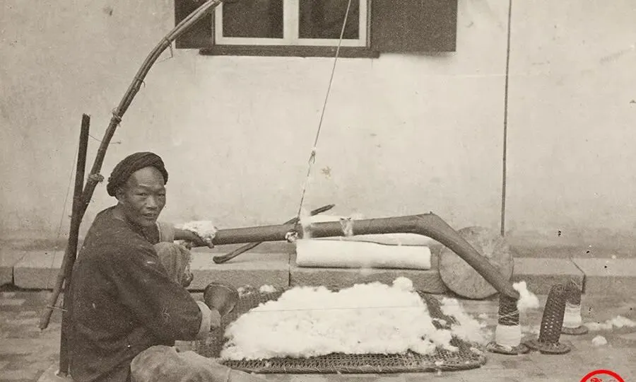 这个长弓叫弹棉弓,木质的弓背发亮,弦上裹了牛筋,男人手里的木棰一下一下敲弦,棉花被震得往上飘,有股轻轻的雪白,旁边压着两只柱形的镇物,地上铺了绷网的床面,小时候跟着奶奶做被子,最迷那声儿,嗡一声抖开,像把冬天的潮气一口气震出去,现在买被芯一拆即用,干净是干净,少了点手上的温度。