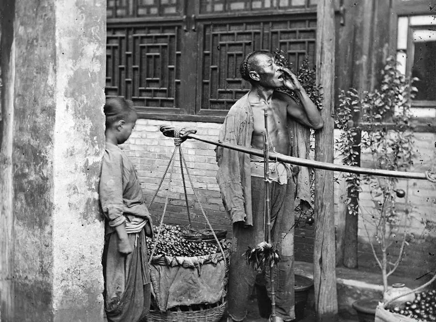 图里这根竹担叫扁担,中间系着老秤,两头是笼和筐,卖的是时令小果子,男人衫子破了口子,瘦胳膊上青筋绷得直,嘴边像是在拉长调子吆喝,“香的哎甜的哎,新摘的……”,我外公年轻时也挑担卖菜,说好货不光靠手,还得靠嗓子,过去一条巷子从早喊到晚,现在喇叭不让放,电商一键下单,热闹全躲进屏幕里了。