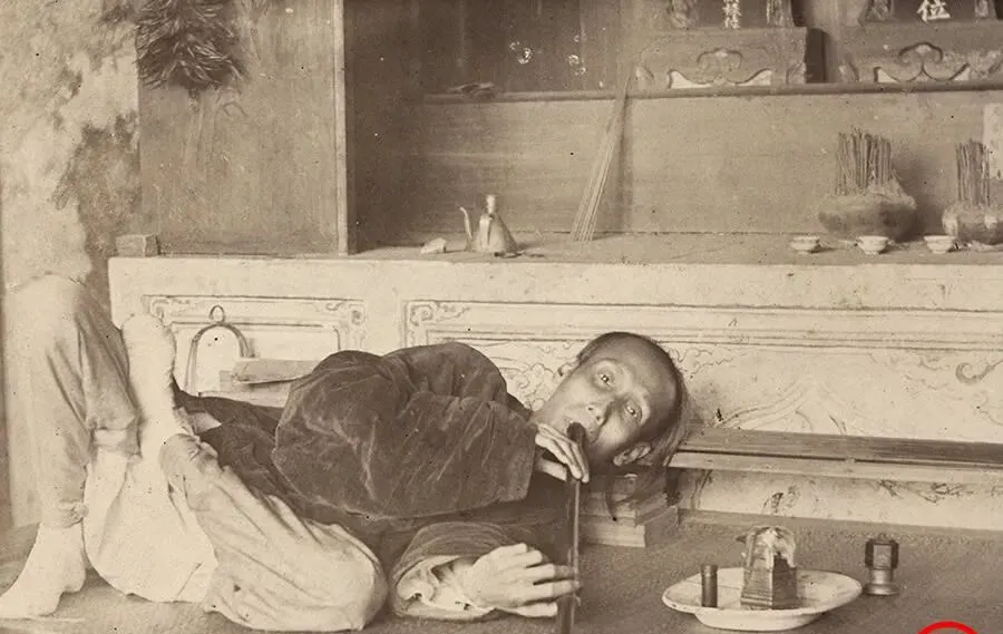 这个长管子叫烟枪,烟灯在一旁亮着小小的芯,男人斜靠着供桌,眼神空着,像是被什么掏走了,木柜上供着神像和香炉,灰掉了一层,照片里没有风,可你光看那张脸就觉得屋里冷,家里老人说起鸦片,只说两个字**“糟蹋”**,那时候,家败人散快得很,现在戒毒有机构有医生,路也不好走,终归比黑屋子里越陷越深要亮堂些。