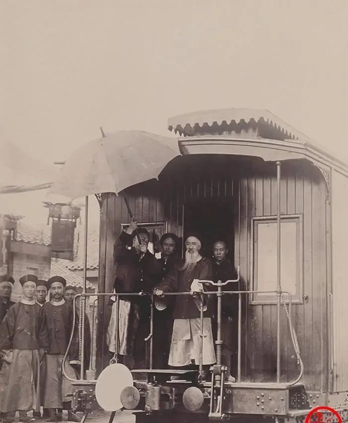 这个车厢叫巡检车,木板镶槽,护栏上铆钉密密,站在中间的是张之洞,个头不高,胡子垂到胸前,伞在人头顶撑着,身边随从拢着衣摆,表情不敢放松,照片不说话,可架势已经把话说完了,新路修到脚下,老官也得登车,以前官员坐轿跨马,现在一脚迈上钢轨,世界在动,他们也得跟着学着动。