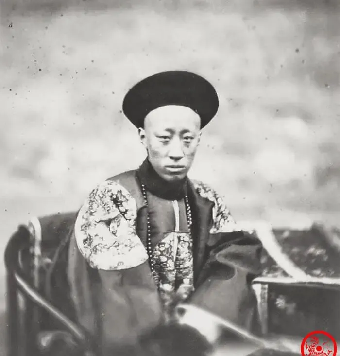图中这位年轻人叫醇亲王某王爷,穿的是朝服褙子,绣片细密,袖口滚边泛着旧绸子的油光,胸前一串朝珠压着衣襟线条,帽沿低低,目光有点倦,却不飘,镜头还不太会讨好人,那会儿曝光慢,得稳住不眨眼才行,摄影师一声别动,他就那么坐着,手背搭在几案边上,指节清瘦,像是刚从营头回来歇一口气。