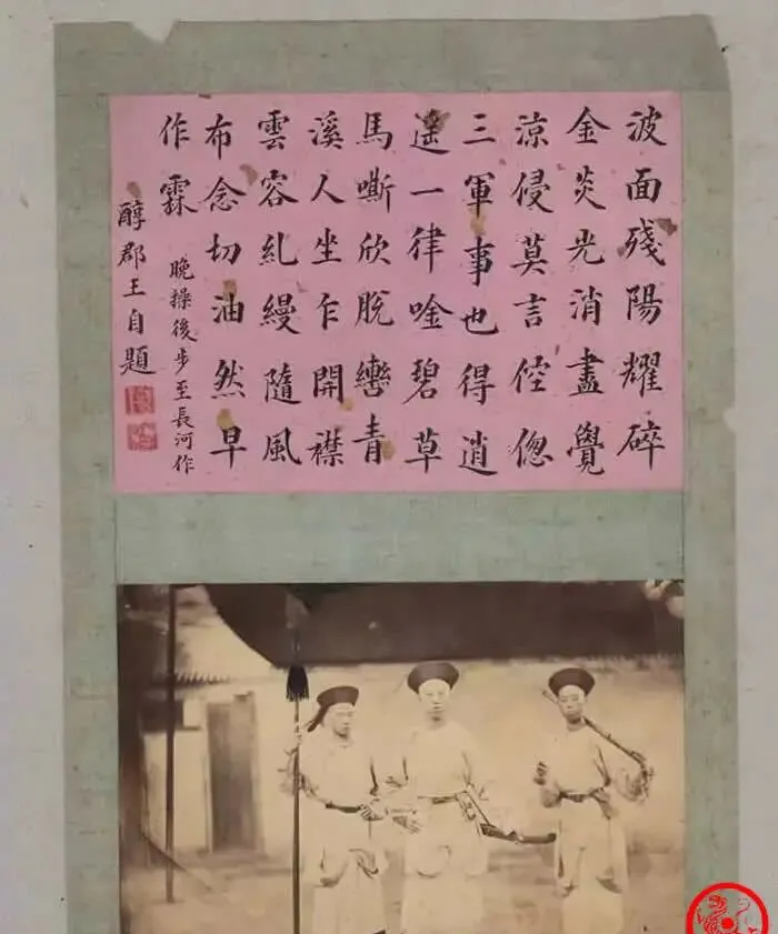 这张老照片叫“装裱成像册”,上头贴一张粉底笺纸,行楷写得干净利落,边上钤印一溜儿红章,王爷自题几句,语气里有点得意也有点自勉,照片就嵌在底下,蓝绫做衬,四角压口规整,家里长辈见了这页,会忍不住说一句,这算是把相片当画像供起来了,那时候可稀罕,能进王府送客的,多半会被翻到这一页,抬头看字,低头看刀,心里就有数了。