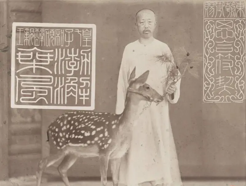 这个有点趣味,图里动物叫梅花鹿,斑点清楚,鹿角未全开,王爷一手执着松枝,一手自然垂着,白袍宽松,像刚洗过晒干那种清爽,旁边大印刻得花里胡哨的,摆在画面上也不突兀,摄影师八成是个懂构图的,奶奶看过这张说,老北京王府里常养鹿,图个吉利,走路轻,院里回声小,不惊人,放今天看就像一张带宠物的生活照,气氛倒是亲切。