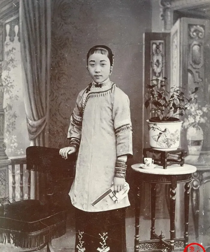 图中这位小娘子叫时髦也不为过,短齐的刘海、贴额的鬓角、袖口绣一圈密实的纹样,衣料看着应是细致的缎或妆绸,手里还攥着一把小折扇,案几上是一盆带画的瓷缸栽花,摆拍讲究环境嘛,最扎眼的还是她脚下,三寸弓作派一目了然,细步挪移才显端庄,当年人说小脚是规矩,现在我们只觉心酸,时髦和束缚搁在一个人身上,镜头就记下了这种拧巴的味道。