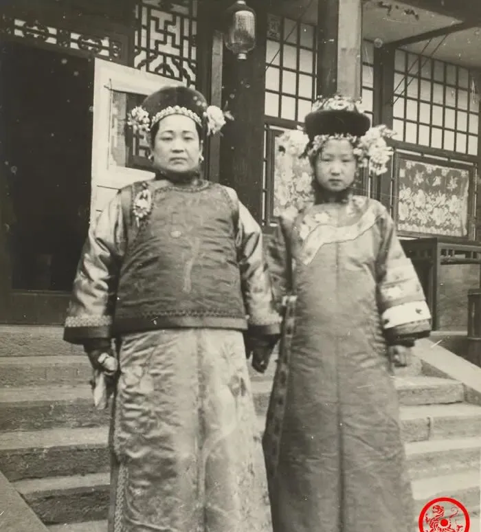 这个穿棉袍的叫旗装,圆领宽袖,里外都厚,头面插花高高一座,女眷出门可不能寒酸,母女俩站在台阶口,门洞里漏出几块花窗,礼仪就从站位上看出来了,娘在外侧稳稳居中,小姑娘半步靠后,奶奶以前说,旗人家里“谁坐哪儿都有讲究”,如今我们拍合照随便一挤,当年的家法在这儿全能看见。