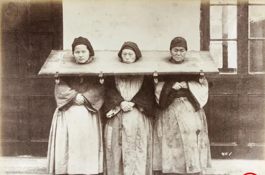 这个沉木板叫枷,横一块木,脖颈扣住就动弹不得,板面打了铁扣,边上还坠钩,三人肩并肩靠墙站着,眼神各不相同,一个愤,一个怯,一个认命,衙门口少不了这等场面,口口相传也讲究个“遮羞”,可真上了街,脸面就不是自己的了,那时候人说“宁走千里路,不惹一纸官司”,看这张就懂了。