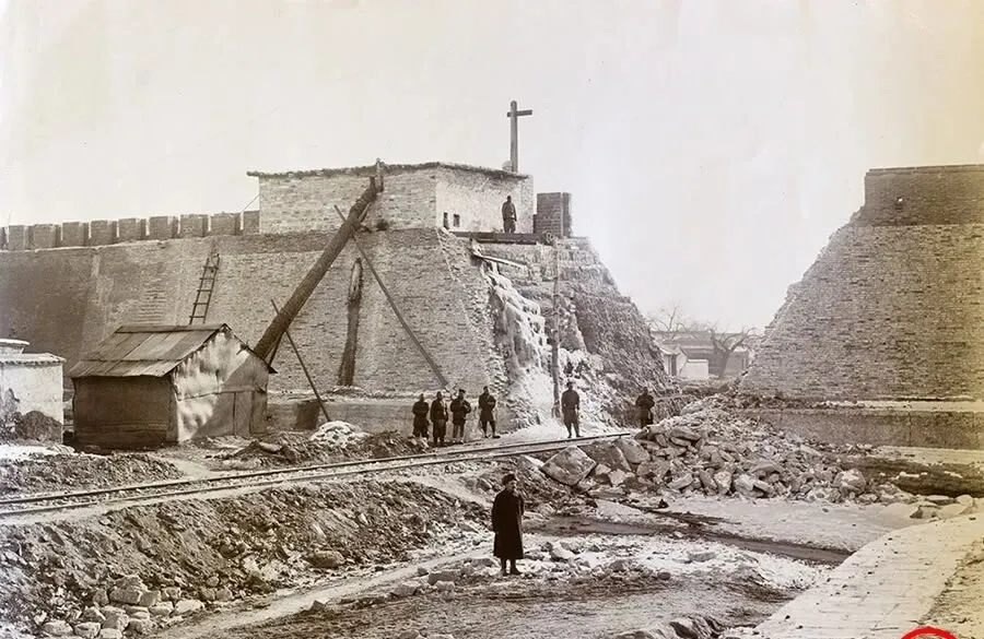 这个豁口叫临时便道,青砖乍裂,碎石乱堆,木架挑起滑车,铁轨笔直插进城根,墙上还站着兵丁守着口子,老爷子指着这类照片总叹一声,他说“城是护身皮,剥开了就要受风”,以前车马慢,城门启闭有时辰,现在钢轨说到哪儿就到哪儿,老规矩拦不住,新的秩序硬生生压了进来。