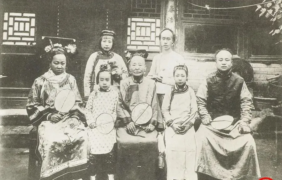 图里这一家子叫全家福照,老宅门口的影壁窗棂花格子齐全,老人的团扇都捏在手里,补服上的纹样规矩得很,男丁穿长马褂,女眷头上钗簪一层叠一层,姿势都挺直,像被那会儿的规矩托着背,拍照不是随便笑的活计,那阵讲究“留个体面”,照相先生喊一声别眨眼,咔嚓一下,就把一家人的辈分和秩序都钉住了。