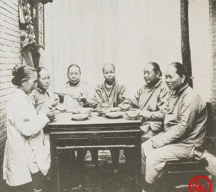 这个场面叫围桌吃饭,木桌抹得发亮,粗碗大勺热气往上冒,衣襟扣得严严实实,大家边吃边唠,筷子在碗壁上轻轻一碰就叮的一声,家里逢个小喜事,做两样硬菜,再来碗面汤,热闹就到位了,那时候吃饭讲究坐得齐整,现在手机往桌上一放,人还没来心先不在桌上了。