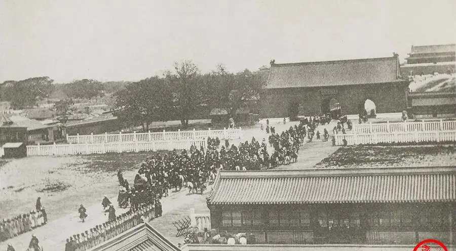 这一列黑压压的是卤簿仪仗,旗幡刀戟一路摆开,从大清门口出发往南去,队伍里鼓乐不见影,只看得出人头如潮,规制还是那一套,流程也还是那一套,可热闹里透着空,像是舞台上换了灯,可台下座位没坐满,仪式在,气运就难说了。