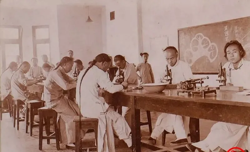 这个留须的先生是外籍教习,穿着深色西装,站位正中,学生围在边上,桌上摆着切片和玻璃皿,靠近的一位侧身探着脑袋,辫子歪在胳膊弯里,像怕打翻了器皿,外教用手指比了个弧度,意思是再调一点光,那会儿外文名词拗口,学生就用土办法记,谁的辫子压在左边就是左旋,压在右边就是右旋,听着好玩,却也好使。