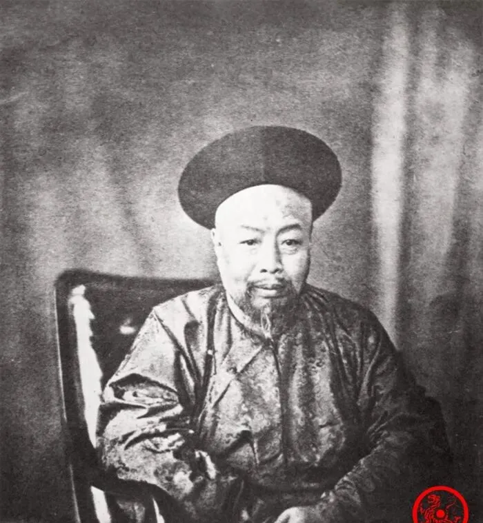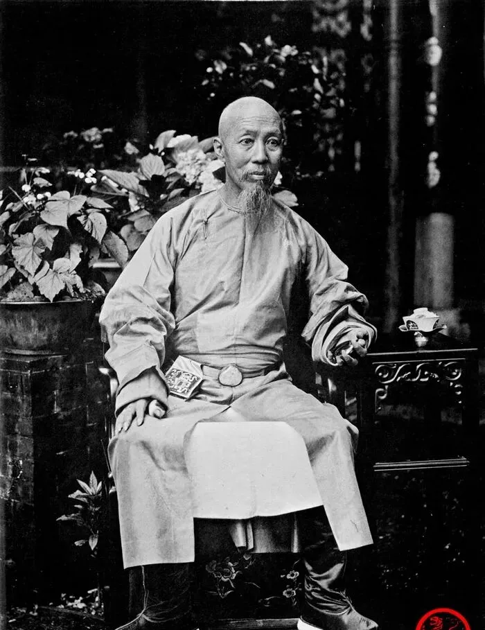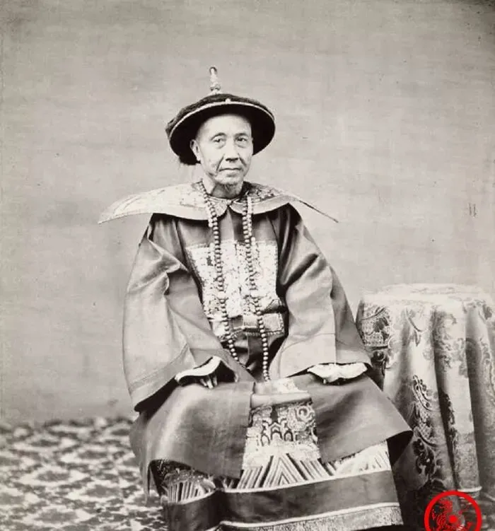 这个老照片里的人物坐姿稳当,圆沿朝冠压得低低的,缎面长袍在灯下一片乌亮,袖口肥大,手背搭在椅沿上不紧不慢,第一眼不是张扬的狠劲,是那种坐住场子的老练劲儿,像在堂上审事,话还没出口,先把心神压住了。