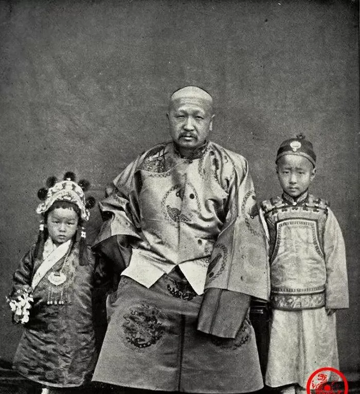 这张最有烟火气,中间一位大袍绣龙纹,两侧站着穿吉服的孩子,像是家中影堂留念,面相厚重,眼窝深,嘴抿得紧,家里要是翻出这样的老照,妈准会说,瞧人家那派头,孩子站得笔直,不哭不闹,摄影棚里的规矩一点不含糊。
