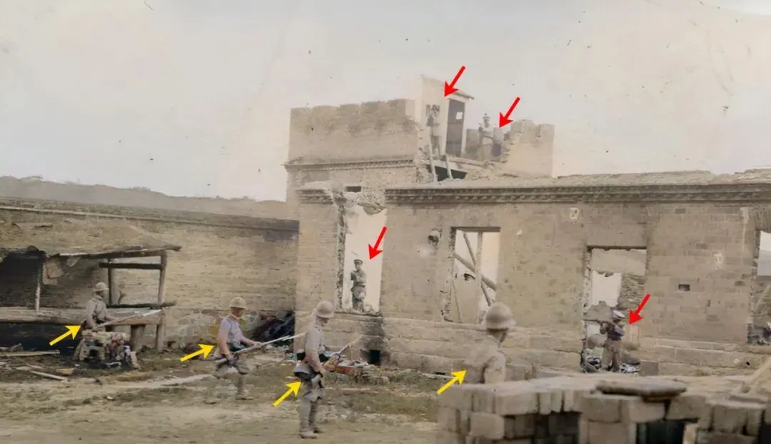 图中破败的院子叫伤城旧埠,砖墙缺口像被火咬过,四名日军举着三八式步枪,刺刀亮得扎眼,中国军人分散在一楼二楼的窗洞口,枪口已经压住了对面,话没多说,气就先顶上来了,中国兵朝着院子里断喝一嗓子,**“缴枪不杀”**的声腔发狠又稳当,这一幕隔着百年也能让人屏住气。
