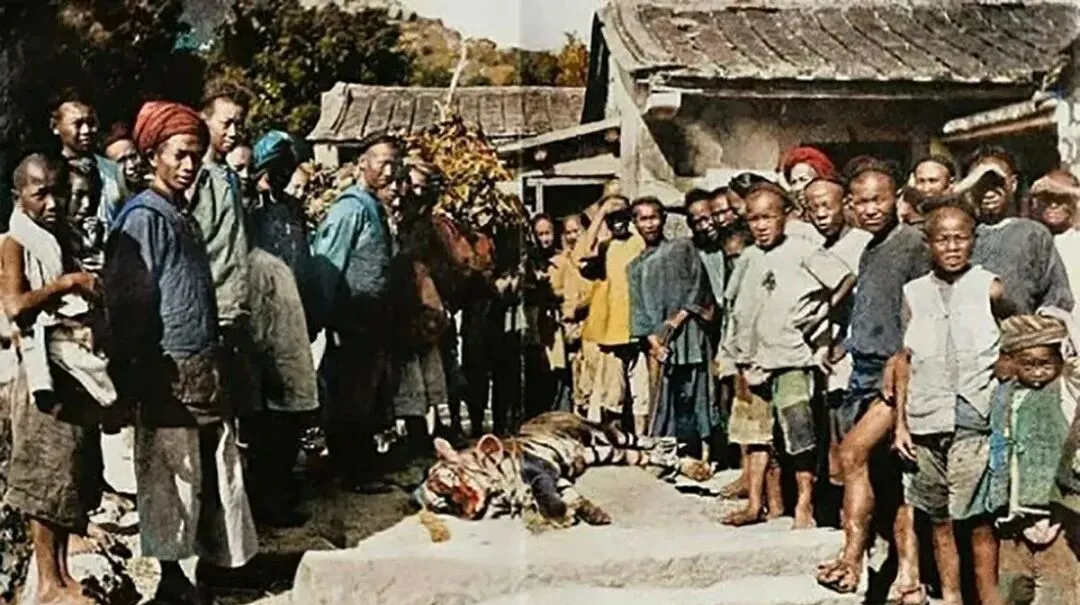 这张围得严严实实的场面,中央躺着的家伙就是华南虎,纹路花得漂亮,肚皮却一动不动,村民们拿着火把和土枪出山,堵在洞口里对着吼,老虎头一次见这么大的阵仗,缩回去不敢窜,伙计们一梭子把它放倒了,抬回村口摆在石台上,锣鼓一响,像过节一样热闹。