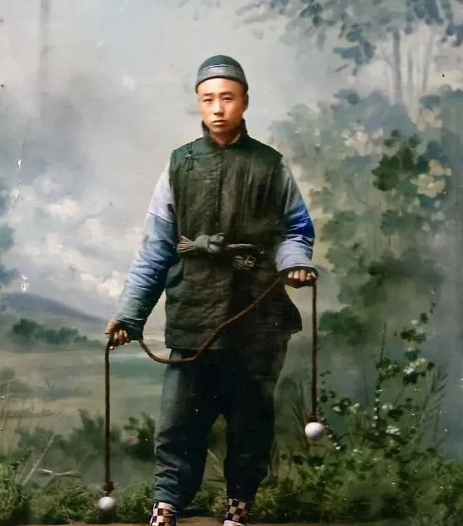 这个软硬兼备的玩意儿叫流星锤,男子握着粗绳两端各拴一颗铁球,绳子有麻的也有链的,铁球有光滑的也有带刺的,抡起来风声呼啦啦,手腕一抖,锤头绕着身子走花,点到肩肘和太阳穴都是要命的路子。
