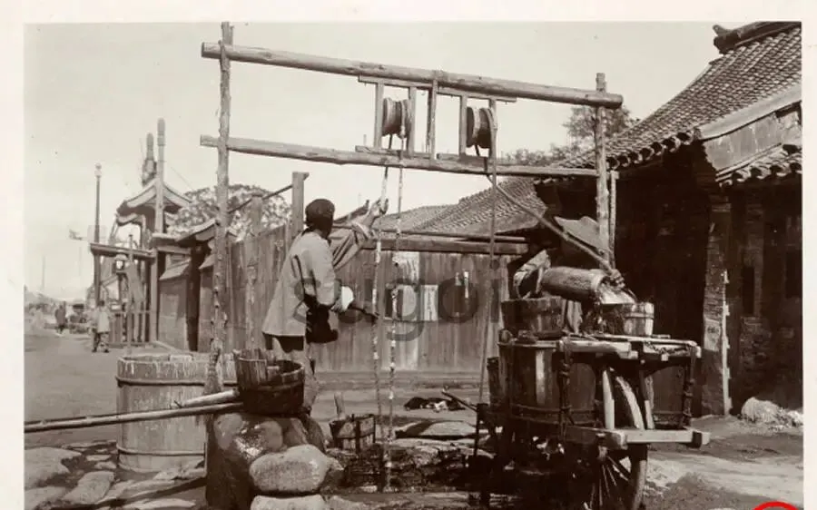 图中这口简陋的水井叫井窝子,木架上挂着两只滑轮,粗绳子套着桶咕噜噜下来,水伕把独轮车靠在井台,车上两个大水柜铁箍勒得紧紧的,一头大方孔灌水,一头小圆孔呲溜往外喘气,等灌满了,他把塞子拧紧,抹一把脸上的水点子,吆喝一句走喽,拐进巷子就开始送,妈妈笑我小气,说你小时候最爱追着水车,等人家放水时伸手摸摸那股凉意。
