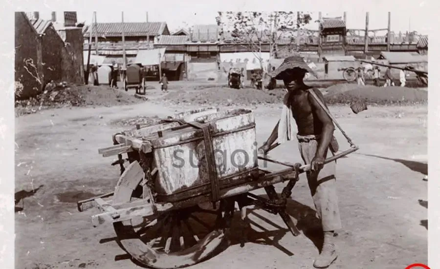 这个沉甸甸的家伙就是水伕用的独轮大车,木把子打着光,车轮子包着铁皮,水柜厚重,木条加铁箍一层层勒着,推起来人得歪着肩,脚底下踩得紧,拐弯时整车像条鱼摆腰,夏天毒日头底下,汗顺着背脊骨往下流,嘴里还念叨一声再走两家就歇会儿,现在自来水表一扭就来,谁还记得这份力气钱。