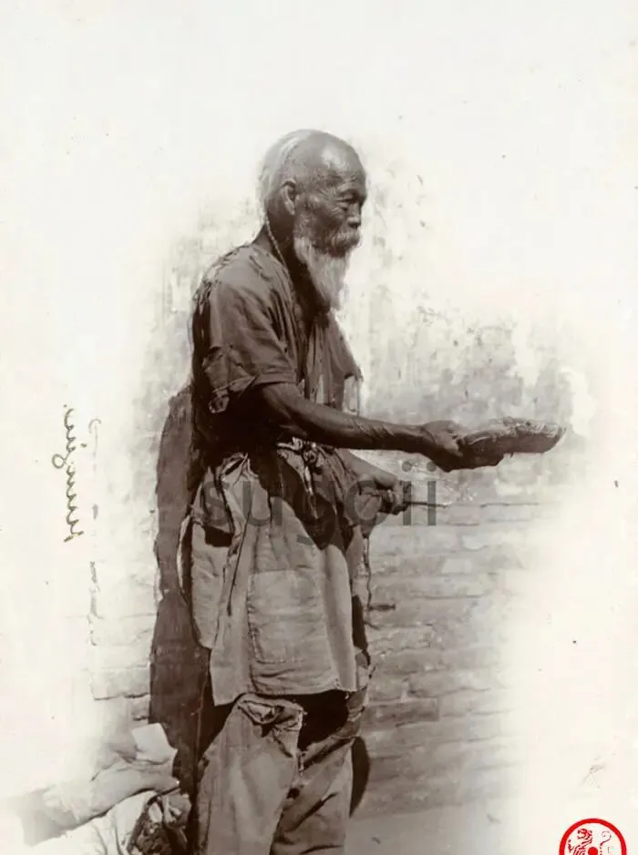 这个佝偻着的身影叫讨口的老乞丐,布衣补了又补,补丁缝到看不出原色,手里捧着个破碗,眼神是又倔又软,旁边墙皮起着霉斑,太阳打过来,影子被拉得老长,外头兵来兵去,里头还有旱情,人扛不住就上街伸手要口饭,乱世最不稀罕的,就是体面。