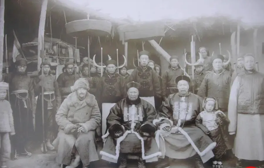 图中这排人马叫文武官员与亲兵合影,前排三位坐着的穿貂边袍褂,胸前挂着长串朝珠,左边毛皮大氅的人身上绒毛炸起一层光,身后站着的一溜亲兵,手里亮着三叉戟和大刀,柄身粗硬,冷气从照片里往外透,爷爷说这阵仗一摆出来,乡间的差役就得往后退两步,官威不在嗓门上,在这身行头上,可别小看这些兵刃,那个时候快枪炮是有了,真要巡乡押犯,还是靠这家伙硬碰硬。