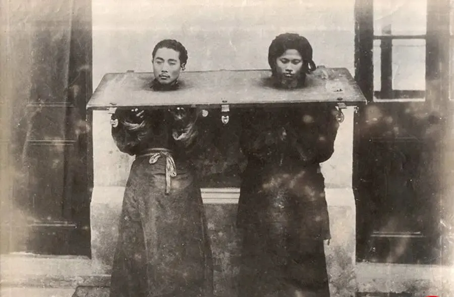 这个沉甸甸的木板叫枷,枷面宽得能挡住胸口,边上扣着锁鼻,两个年轻人脖子被卡在圆孔里,肩膀被压得耷拉下去,站在门洞前不敢看镜头,我外婆见到这张叹了一句,以前犯了事儿不光是吃苦,还是拿脸面去顶罪,现在呢,关起门走程序,街口晾人的戏少了,可那种公开羞辱的疼啊,隔着百年都能往外渗。
