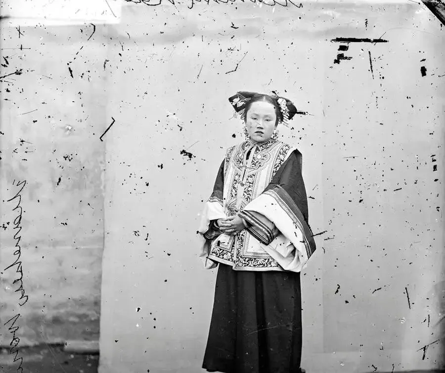 这个衣着讲究的女孩穿的是花盆底鞋,鞋跟像一个小方墩子,绣线盘龙绕凤,袖口里又套了一层细滚边,脸蛋略鼓,发饰左右一对压耳,走起路来身子要微微摆,脚下叩叩两声,我小时候在戏台后场见过一双旧的,拿在手里沉,扛着走可真费劲,奶奶说以前姑娘家穿这个能显规矩,现在鞋柜里一色运动鞋,追公交跑得飞快。
