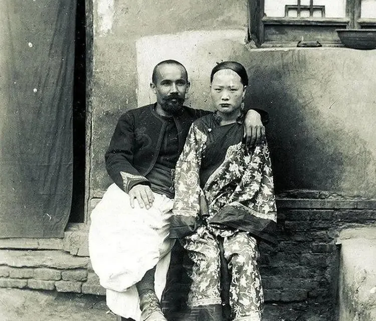 这张最扎心,画面里男人胳膊横着压在女子肩上,手指捏着衣襟,女人眉心发白像是抹了粉,眼神钝钝地往前看,嘴角绷得直直的,院墙上有裂口,窗台下一只粗瓷碗冷不丁地搁着,妈妈看见说了一句,当年陌生男人这样拍照,等于是把人名节按在地上摩擦,现在街角随手就是合影,手机一抬一放,时代的边界线就这么挪了。