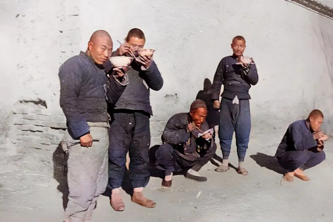 你再看照片里那几位的神情,有人抬眼打量镜头,有人闷头扒拉,左边那位手里还攥着个铁器,八成是刚收工,饭勺没放下,家伙事儿也没放,这种连缝都不愿耽搁的劲头,是那会儿生活逼出来的,面条就着咸菜,嚼得带劲,汗味儿和蒸汽混在一起,才是一顿正经饭。