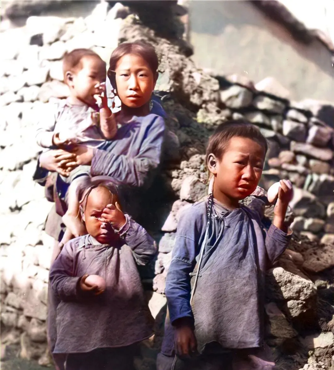你看她抱孩子的手法,左臂兜着,右手护着后脑勺,姿势熟练得很,应该不是第一次出门看弟弟妹妹,脚边的土块乱堆着,身后是干砌的石墙,缝里塞着草和泥,风一过,毛边都抖,两个孩子手里各攥着一个白面馒头,嚼得慢腾腾,馒头是那会儿最好的零嘴,干硬了也舍不得丢,能在嘴里捂出点香味来。